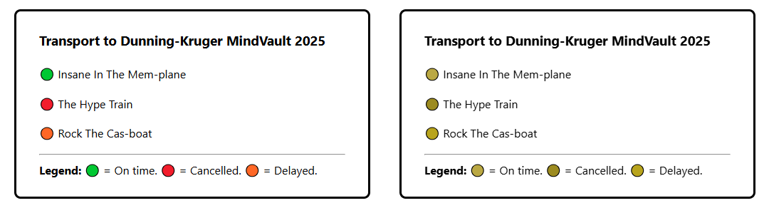 All of these examples would benefit from including icons and/or text to reduce reliance on colour alone. For more compact or minimalist interfaces, consider using different icon shapes (such as circles, squares, or triangles) to distinguish between states.