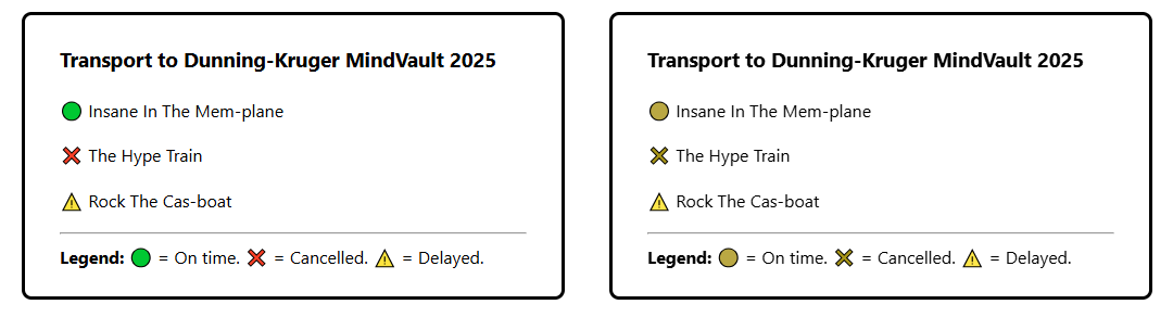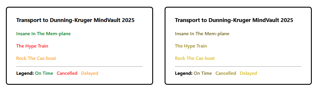 In the following sections, the left side of each image is a "full colour" version of a fake transport timetable, and the right side is the same timetable with colour vision loss rendering applied to it.